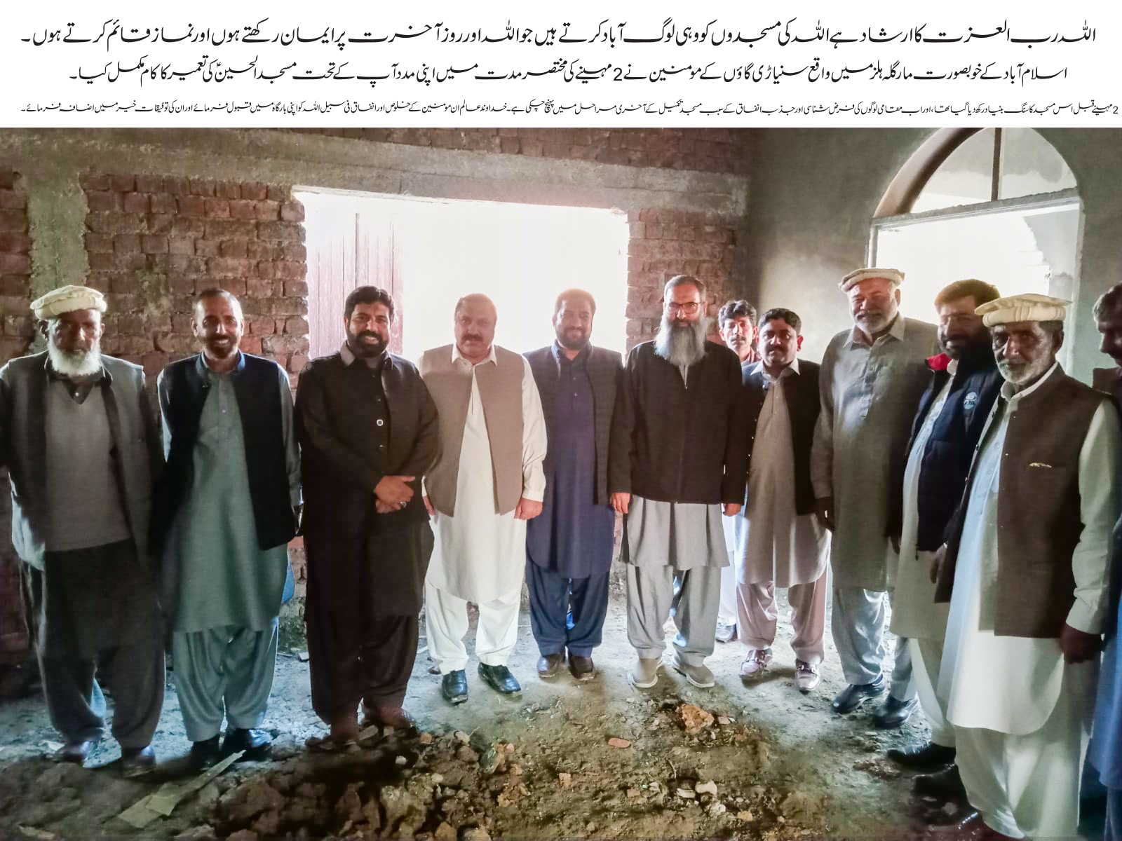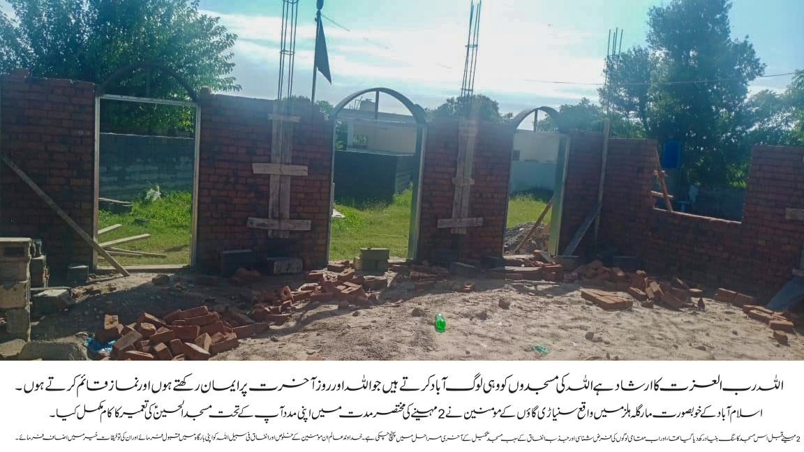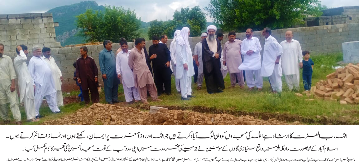اسلام آباد کے خوبصور ت مارگله هلز میں واقع سنیاڑی گاؤں کے مومنین نے 2مہینے کی مختصر مدت میں اپنی مدد آپ کے تحت مسجدالحسین ؑ کی تعمیرکا کام مکمل کیا۔ 2مہینےقبل اس مسجد کاسنگ بنیاد رکھ دیاگیا تھا، اور اب مقامی لوگوں کی فرض شناسی اور جذبہ انفاق کے سبب مسجد تکمیل کے آخری مراحل میں پہنچ چکی ہے۔خداوند عالم ان مومنین کے خلوص اور انفاق فی سبیل اللہ کو اپنی بارگاہ میں قبول فرمائے اور ان کی توفیقات خیر میں اضافہ فرمائے۔